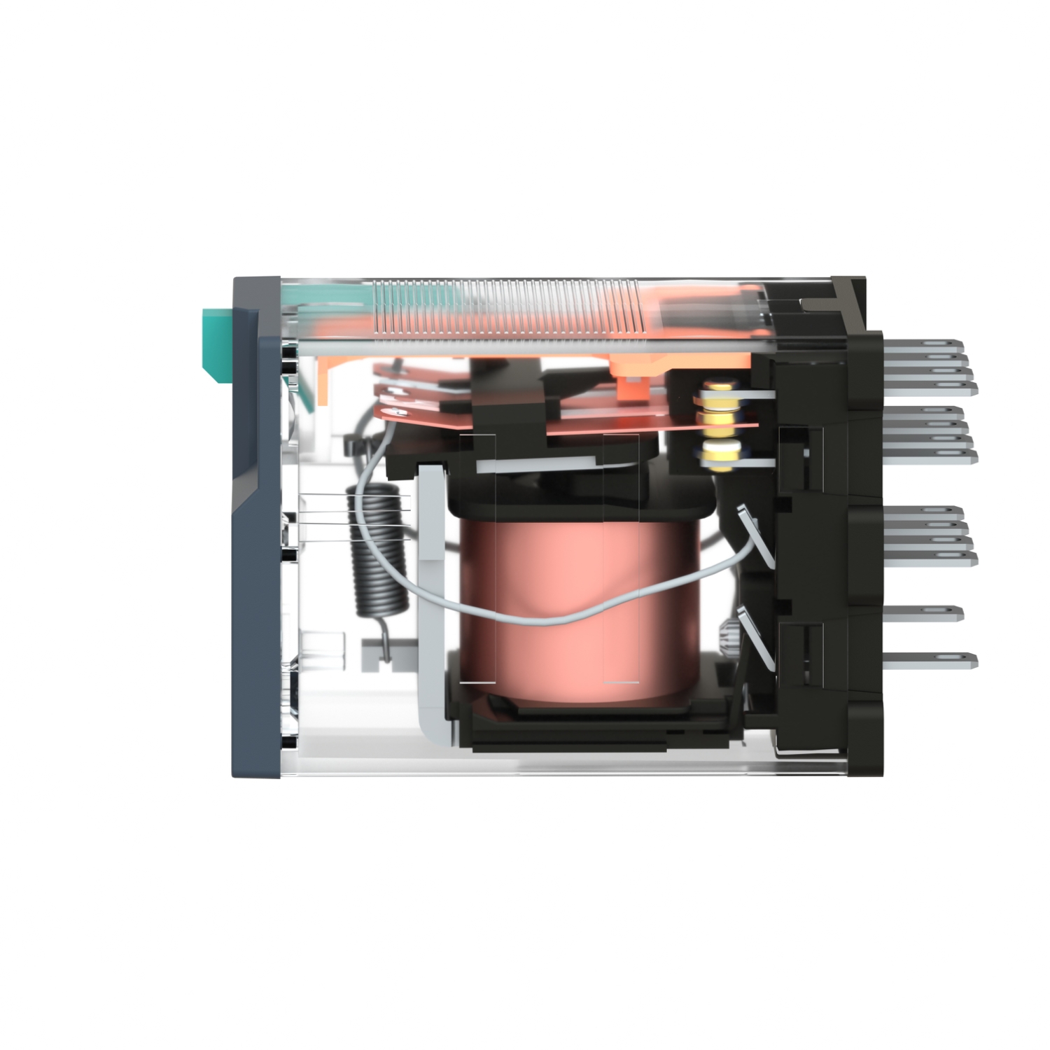 Los relevadores miniatura RXM son parte de los relevadores electromecánicos Harmony. Este es un relevador enchufable que debe montarse en una toma RXZE. Es un relevador de 4 CA con corriente nominal de 6A, tensión del circuito de control de 24 V CC. También ofrece un botón de prueba con carga y un indicador mecánico para el estado de contacto. El botón de prueba se activa momentáneamente pulsando el pulsador azul en la parte frontal y se bloquea al girar la parte verde hacia arriba. El indicador mecánico está junto al botón de prueba, donde un indicador naranja indica el estado de contacto del relevador. Funcionalidad para sistemas automatizados con lógica cableada para complementar las funciones de los controladores lógicos programables industriales (PLC). Su diseño es apto para máquinas industriales, embalaje, textil, HVAC, paneles de control de automatización, tableros de baja/media tensión, controles de motor, interfaces PLC, fuentes de alimentación, edificios o equipo médico, controles de iluminación. Es un producto premium verde y cumple con las normas y certificaciones internacionales como IEC, CE, UL, CSA, EAC, Lloyd's, RoHS y REACH. El relevador de RXM debe utilizarse con una toma RXZE (abrazadera de tornillo, conector de tornillo, terminal pulsador). Para protegerse contra las vibraciones, se puede agregar una abrazadera de plástico/metal al zócalo. También están disponibles módulos de protección y leyenda de marcado. La referencia incluye solamente el relevador. Los relevadores RXM plug-in son una serie de relevadores industriales plug-in diseñados para sistemas de automatización simples y complejos.