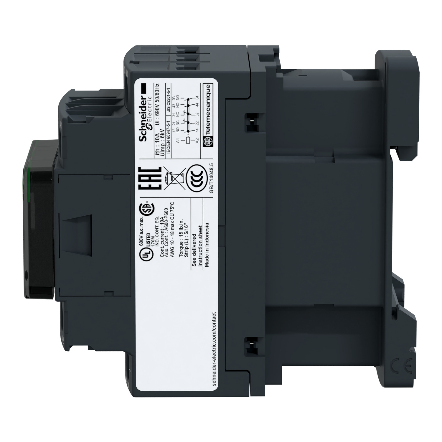 Relevador de control TeSys D, 5 contactos (3NO + 2NC), 10A/690V, para control de cargas electromagnéticas AC-15/DC-13. Proporciona un circuito de control de CA de 110 V 50/60 Hz, conexión mediante terminales de abrazadera de tornillo. Para altas tasas de operación hasta 180 ciclos/min y temperatura ambiente -40/+60°C, proporciona alta confiabilidad y durabilidad. Compacto (45 mm de ancho), para clipar en carril DIN de 35 mm o fijar mediante tornillo. Certificación multiestándar (IEC, UL, CSA, CCC, EAC, Marine), producto Green Premium (RoHS/REACh).