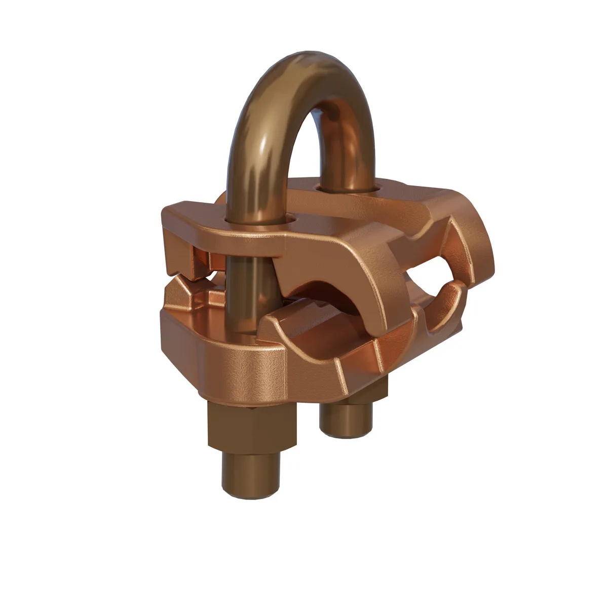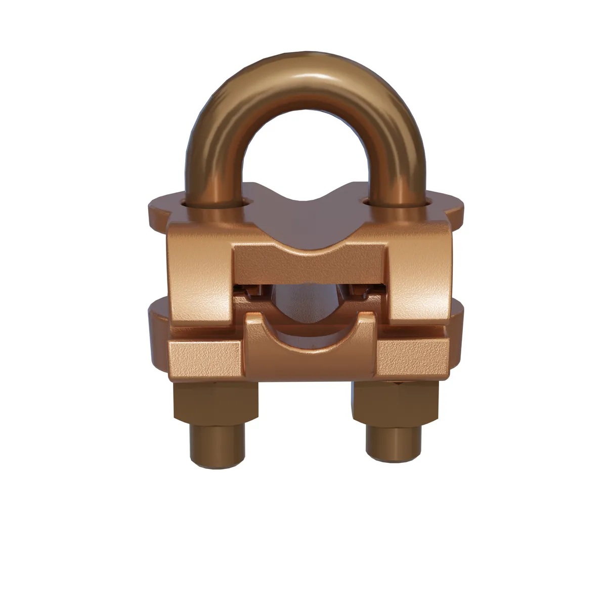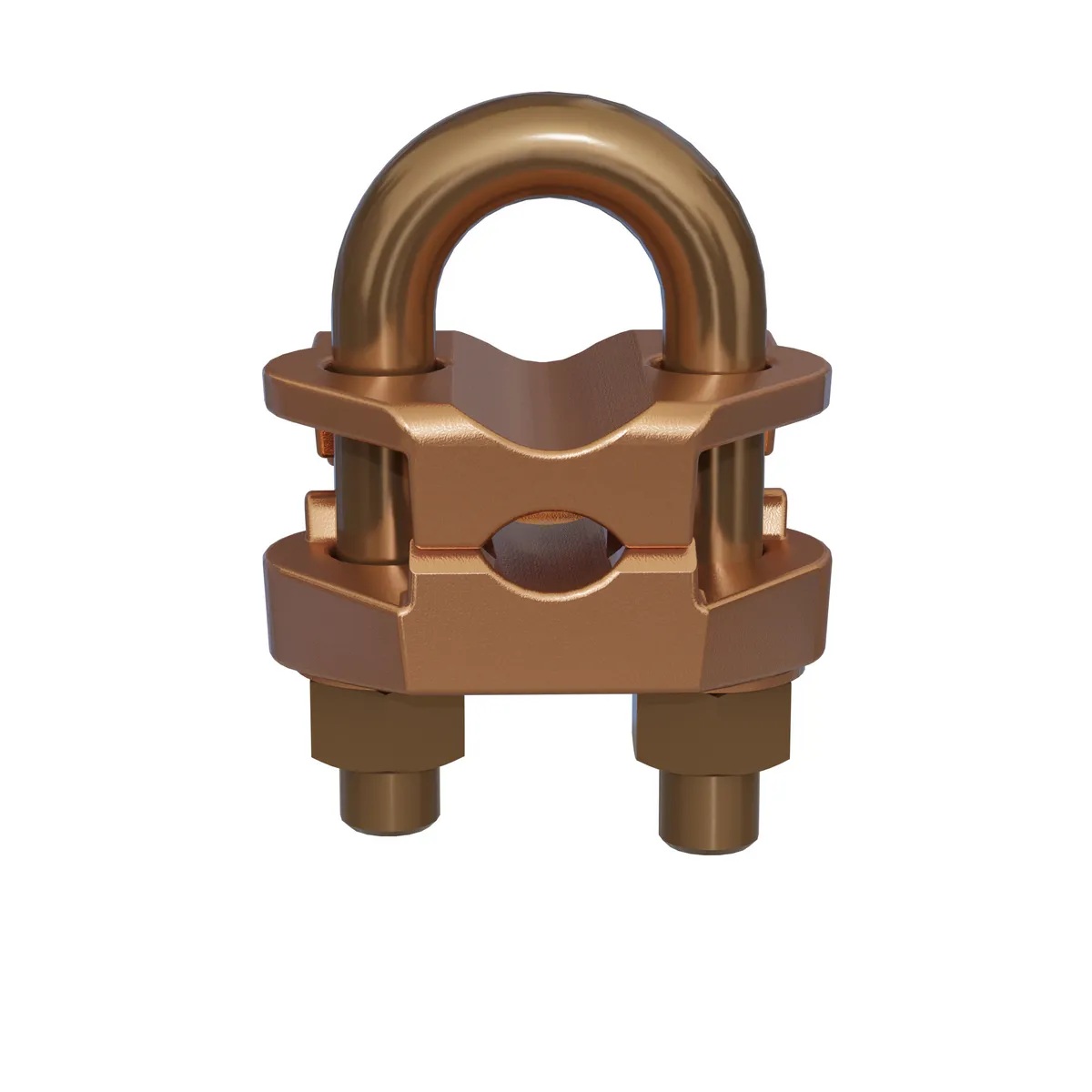 Conector de conexión a tierra mecánica, cable a varilla o tubería, 2/0 AWG (Sol) -250 kcmil, tubería de 3/8", varilla de 5/8"-3/4", barra de refuerzo #5-#6, inmersión brillante. Herrajes de bronce de silicio.