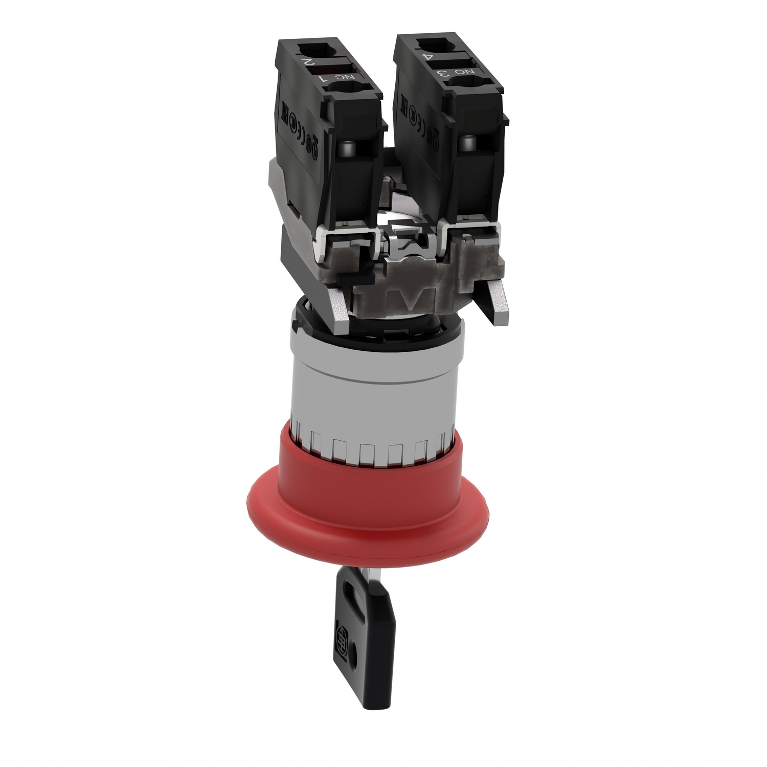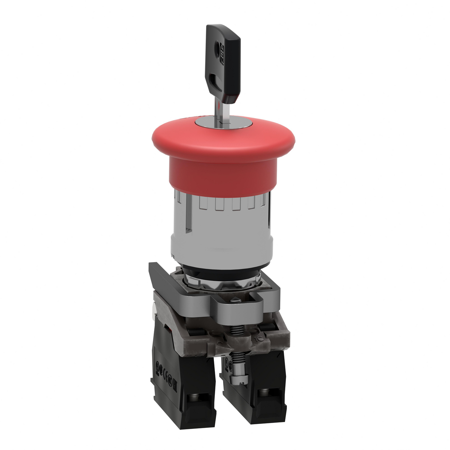 Este Harmony XB4 de parada/parada de emergencia 40mm de cabeza redonda modular pulsador rojo funciona con un mecanismo de liberación de llave enganchada (llave no.455). Tiene un bisel metálico. Este botón de parada/apagado de emergencia, también llamado EMS (parada de máquina de emergencia) y EMO (apagado de emergencia), se instala fácilmente en interruptores estándar de 22 mm de diámetro y se conecta con conexiones simples de abrazadera de tornillo. Es claramente diferenciable visualmente a una distancia gracias a un color claro y a una destacada forma de champiñón de 40 mm. Es resistente al impacto, al polvo, al agua y a las vibraciones gracias a su IP66 / IP67 / IP69 / IP69K, lo que lo hace ideal para su operación en entornos hostiles.