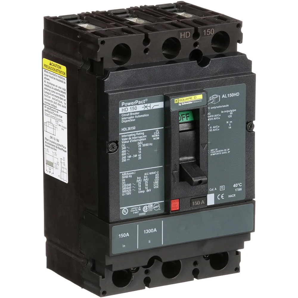 El interruptor automático PowerPact HDL36150, de la marca Square D es una opción confiable y segura para tus necesidades de protección y switcheo en tableros de control industriales, sirviendo como interruptor de acometida principal y como desconectador del tablero protegiendo a los circuitos. También es utilizado en edificios y otras aplicaciones para distribuciones eléctricas pudiéndose utilizar como interruptor de acometida principal, brindando protección a los dispositivos conectados. Con una corriente nominal de 150A y 3 polos, este interruptor cuenta con una protección de disparo termomagnético de 1700 A, con una capacidad interruptiva de 14kA a 600 VCA y 50/60 Hz, lo que garantiza un rendimiento excepcional. Además, su tensión asignada de empleo de 690 VCA lo hace adecuado para una amplia gama de aplicaciones. Su modo de montaje de unidad de zapatas (chasis lutze) permite una instalación sencilla y segura. Sus terminales son de tipo Snap-in las cuales facilitan la conversión entre la barra colectora y las zapatas. Estos interruptores marco-H, vienen en construcción de montaje en unidad de 2 a 3 polos y también en construcción I-Line de 2 a 3 polos. En específico el interruptor HDL36150 es de 3 polos y cuenta con zapatas en ambos lados, en el lado de la línea y en el lado de la carga. Los interruptores automáticos PowerPact marco-H son de color negro, tienen un botón de pulsación para disparar manualmente el interruptor, están equipados con contactos giratorios de doble ruptura que reducen la cantidad de picos de corriente durante una falla de cortocircuito y existen dos opciones, con protección termomagnética o electrónica. Además, este interruptor cuenta con una garantía de 18 meses y cumple con certificaciones como UL, IEC, NEMA, CSA y NOM, lo que garantiza su calidad y seguridad. Este interruptor acepta cables de AWG 14 – 3/0 (aluminio o cobre) y tiene una clasificación de corriente continua del 80%. Con dimensiones compactas de 163 mm de alto y 104 mm de ancho, se adapta fácilmente a diferentes espacios y es compatible con una gran variedad de gabinetes, tableros y centros de carga. No te preocupes por los accesorios, ya que el interruptor automático PowerPact HDL36150 cuenta con una gran variedad de opciones para aplicaciones en distribución eléctrica y en tableros de control. Disfruta de las características del interruptor PowerPact HDL36150 y protege tus tableros de control y la distribución eléctrica de tu edificio o construcción industrial con la calidad y tranquilidad que ofrece este interruptor.