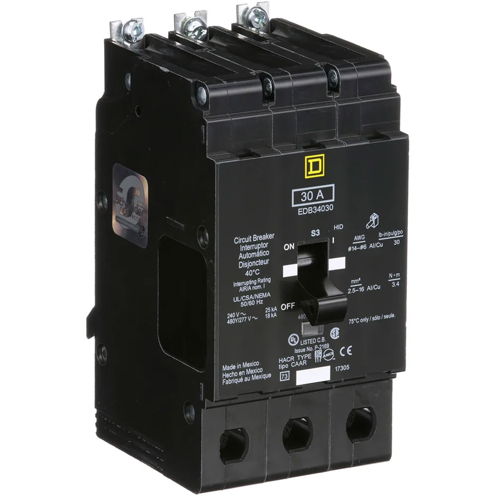 Los interruptores automáticos en miniatura marco E son interruptores de tableros de iluminación que han demostrado ser efectivos y confiables, brindan una amplia variedad de características sólidas que se usan específicamente en los tableros NF de la marca Square D. El interruptor automático marco E de la marca Square D ¨EDB34030¨cuenta con 3 Polos, 30 Amperes, 480Y/277 VCA de voltaje operativo máximo y una capacidad máxima interruptiva de 18/25kA, este interruptor es la solución perfecta para proteger tus sistemas eléctricos. Con su capacidad de unidad de disparo de 875 A, una corriente de retención de 270 A y una corriente nominal de 30 A, este interruptor en miniatura brinda una protección confiable y eficiente. Este interruptor automático cuenta con una capacidad de interrupción máxima de 25 kA a 120 V CA, lo que garantiza una respuesta rápida y precisa ante cortocircuitos y sobrecargas. Con su máximo voltaje operativo de 480Y/277 VCA, este interruptor automático garantiza un rendimiento óptimo incluso en las situaciones más exigentes. Además, su indicador de disparo te permite identificar fácilmente cuando se ha activado para que puedas tomar las medidas necesarias. Gracias a su tecnología termomagnética, este interruptor ofrece una protección óptima contra cualquier fluctuación o falla en el sistema eléctrico. Su clasificación HACR y su certificación UL aseguran que cumple con los más altos estándares de calidad y seguridad. Con un montaje atornillable para mantener el interruptor en su lugar y un diseño compacto, este interruptor es fácil de instalar en cualquier tablero NF gracias a este tipo de montaje. Con tres polos y tres espacios, se integra perfectamente en los paneles NF como por ejemplo al tablero NF de la marca Square D NF430L2, entre otros más. Las dimensiones de este interruptor son de 143. 76mm (alto), 74. 68mm (ancho) y 102. 87mm (profundidad) y su temperatura de funcionamiento es de 40 grados C. Además, cuenta con una garantía de 18 meses. Protege tus sistemas eléctricos con el interruptor automático atornillable en miniatura EDB34030.
