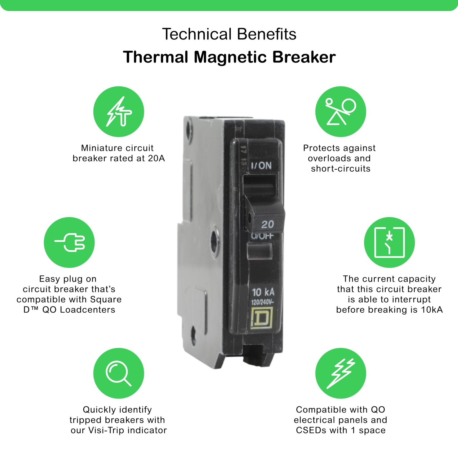 Los interruptores termomagnéticos de uno, dos y tres polos QO se montan directamente en centros de carga, tableros de distribución y alumbrado NQ y centros de medición, brindando protección contra sobrecargas y cortocircuitos. Estos interruptores tienen un mecanismo de palanca libre de disparo y son de acción rápida, también tienen un indicador visual de disparo VisiTrip, que indica la activación del interruptor. ¿Conoces el interruptor termomagnético mini de la marca Square D modelo QO120? Este interruptor automático en miniatura está diseñado para proteger contra sobrecargas y cortocircuitos, brindando una solución eficiente y segura para tus necesidades eléctricas. Con una corriente nominal de 20 A y una clasificación de voltaje de 120/240 V CA, este interruptor ofrece un rendimiento óptimo en aplicaciones residenciales, comerciales e industriales. Su tipo de montaje enchufable facilita la instalación y conexión en centros de carga, lo que te permite ahorrar tiempo y esfuerzo. Este interruptor termomagnético de 1 polo tiene un diseño estándar y cuenta con una capacidad de interrupción de 10 kA a 120/240 V CA 50/60 Hz. Además, está cuenta con la clasificación HACR. Con una conexión eléctrica de placa de presión, este interruptor ofrece una conexión sólida y confiable. Puedes utilizar cables de calibre AWG 14 a AWG 8 de cobre o aluminio para una instalación segura y eficiente. El torque de apriete recomendado es de 4 N. m. Con dimensiones compactas de 76 mm de altura y 19 mm de ancho, este interruptor ocupa poco espacio en tu panel eléctrico. Además, cuenta con certificaciones UL y CSA, lo cual asegura su calidad y cumplimiento con los estándares internacionales. Además, cuenta con un periodo de garantía de 18 meses, brindándote tranquilidad y respaldo en tu compra. Estos interruptores se montan directamente en centros de carga, tableros NQ y centros de medición, en este caso algunos ejemplos de compatibilidad de este interruptor son: NQ30L2C14 y QO2L70RB entre otros muchos más productos de la marca Square D. Los Interruptores automáticos termomagnéticos en miniatura de la marca Square D son la elección perfecta para una protección confiable y eficiente en tus instalaciones eléctricas. Aprovecha las características únicas y beneficios excepcionales del interruptor mini QO120 para garantizar seguridad y rendimiento de tus circuitos eléctricos.