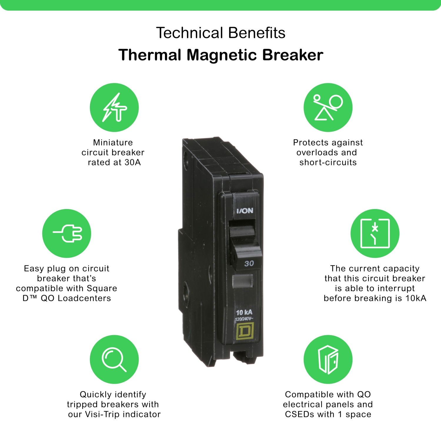 Los interruptores termomagnéticos de uno, dos y tres polos QO, se montan directamente en centros de carga, tableros de distribución y alumbrado NQ y centros de medición, brindando protección contra sobrecargas y cortocircuitos. Estos interruptores tienen un mecanismo de palanca libre de disparo y son de acción rápida, también tienen un indicador visual de disparo VisiTrip, que indica la activación del interruptor. ¿Conoces el interruptor termomagnético mini de la marca Square D modelo QO130? Este interruptor automático en miniatura está diseñado para proteger contra sobrecargas y cortocircuitos, brindando una solución eficiente y segura para tus necesidades eléctricas. Con una corriente nominal de 30 A y una clasificación de voltaje de 120/240 V CA, este interruptor ofrece un rendimiento óptimo en aplicaciones residenciales, comerciales e industriales. Su tipo de montaje enchufable facilita la instalación y conexión en centros de carga, lo que te permite ahorrar tiempo y esfuerzo. Este interruptor termomagnético de 1 polo tiene un diseño estándar y cuenta con una capacidad de interrupción de 10 kA a 120/240 V CA 50/60 Hz. Además, está cuenta con la clasificación HACR. Con una conexión eléctrica de placa de presión, este interruptor ofrece una conexión sólida y confiable. Puedes utilizar cables de calibre AWG 14 a AWG 8 de cobre o aluminio para una instalación segura y eficiente. El torque de apriete recomendado es de 4 N. m. Con dimensiones compactas de 76 mm de altura y 19 mm de ancho, este interruptor ocupa poco espacio en tu panel eléctrico. Además, cuenta con certificaciones UL y CSA, lo cual asegura su calidad y cumplimiento con los estándares internacionales. Además, cuenta con un periodo de garantía de 18 meses, brindándote tranquilidad y respaldo en tu compra. Estos interruptores se montan directamente en centros de carga, tableros NQ y centros de medición, en este caso algunos ejemplos de compatibilidad de este interruptor son: QOD4FB y QOX208 entre otros muchos más productos de la marca Square D. Los Interruptores automáticos termomagnéticos en miniatura de la marca Square D son la elección perfecta para una protección confiable y eficiente en tus instalaciones eléctricas. Aprovecha las características únicas y beneficios excepcionales del interruptor mini QO130 para garantizar seguridad y rendimiento de tus circuitos eléctricos.