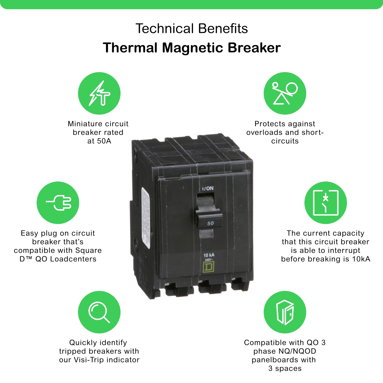 Los interruptores termomagnéticos de uno, dos y tres polos QO, se montan directamente en centros de carga, tableros de distribución y alumbrado NQ y centros de medición, brindando protección contra sobrecargas y cortocircuitos. Estos interruptores tienen un mecanismo de palanca libre de disparo y son de acción rápida, también tienen un indicador visual de disparo VisiTrip, que indica la activación del interruptor. ¿Conoces el interruptor termomagnético mini de la marca Square D modelo QO350? Este interruptor automático en miniatura está diseñado para proteger contra sobrecargas y cortocircuitos, brindando una solución eficiente y segura para tus necesidades eléctricas. Con una corriente nominal de 50 A y una clasificación de voltaje de 120/240 V CA, este interruptor ofrece un rendimiento óptimo en aplicaciones residenciales, comerciales e industriales. Su tipo de montaje enchufable facilita la instalación y conexión en centros de carga, lo que te permite ahorrar tiempo y esfuerzo. Este interruptor termomagnético de 3 polos tiene un diseño estándar y cuenta con una capacidad de interrupción de 10 kA a 120/240 V CA 50/60 Hz. Además, está cuenta con la clasificación HACR. Con una conexión eléctrica de conexión de terminales, este interruptor ofrece una conexión sólida y confiable. Puedes utilizar cables de calibre AWG 8 a AWG 2 de cobre o aluminio para una instalación segura y eficiente. El torque de apriete recomendado es de 5 N. m. Con dimensiones compactas de 76 mm de altura y 57 mm de ancho, este interruptor ocupa poco espacio en tu panel eléctrico. Además, cuenta con certificaciones UL y CSA, lo cual asegura su calidad y cumplimiento con los estándares internacionales. Además, cuenta con un periodo de garantía de 18 meses, brindándote tranquilidad y respaldo en tu compra. Estos interruptores se montan directamente en centros de carga, tableros NQ y centros de medición, en este caso algunos ejemplos de compatibilidad de este interruptor son: QO24L70RB, QO612L100RB entre otros muchos más productos de la marca Square D. Los Interruptores automáticos termomagnéticos en miniatura de la marca Square D son la elección perfecta para una protección confiable y eficiente en tus instalaciones eléctricas. Aprovecha las características únicas y beneficios excepcionales del interruptor mini QO350 para garantizar seguridad y rendimiento de tus circuitos eléctricos.