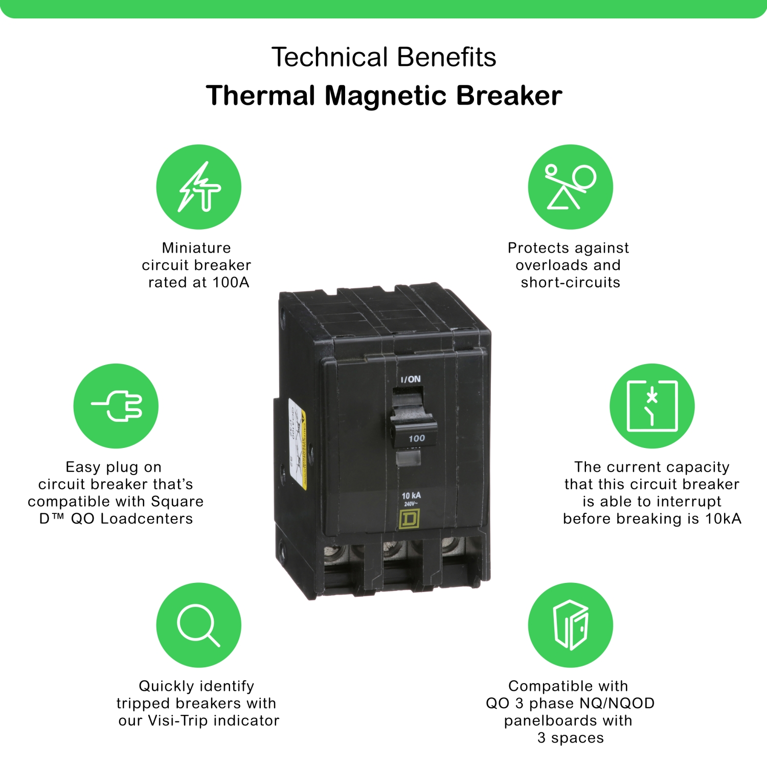 Los interruptores termomagnéticos de uno, dos y tres polos QO, se montan directamente en centros de carga, tableros de distribución y alumbrado NQ y centros de medición, brindando protección contra sobrecargas y cortocircuitos. Estos interruptores tienen un mecanismo de palanca libre de disparo y son de acción rápida, también tienen un indicador visual de disparo VisiTrip, que indica la activación del interruptor. ¿Conoces el interruptor termomagnético mini de la marca Square D modelo QO3100? Este interruptor automático en miniatura está diseñado para proteger contra sobrecargas y cortocircuitos, brindando una solución eficiente y segura para tus necesidades eléctricas. Con una corriente nominal de 100 A y una clasificación de voltaje de 120/240 V CA, este interruptor ofrece un rendimiento óptimo en aplicaciones residenciales, comerciales e industriales. Su tipo de montaje enchufable facilita la instalación y conexión en centros de carga, lo que te permite ahorrar tiempo y esfuerzo. Este interruptor termomagnético de 3 polos tiene un diseño estándar y cuenta con una capacidad de interrupción de 10 kA a 120/240 V CA 50/60 Hz. Además, está cuenta con la clasificación HACR. Con una conexión eléctrica de conexión de terminales, este interruptor ofrece una conexión sólida y confiable. Puedes utilizar cables de calibre AWG 4 a AWG 2/0 de cobre o aluminio para una instalación segura y eficiente. El torque de apriete recomendado es de 5. 6 N. m. Con dimensiones compactas de 89 mm de altura y 57 mm de ancho, este interruptor ocupa poco espacio en tu panel eléctrico. Además, cuenta con certificaciones UL y CSA, lo cual asegura su calidad y cumplimiento con los estándares internacionales. Además, cuenta con un periodo de garantía de 18 meses, brindándote tranquilidad y respaldo en tu compra. Estos interruptores se montan directamente en centros de carga, tableros NQ y centros de medición, en este caso algunos ejemplos de compatibilidad de este interruptor son: QO816L100RB, QO612L100RB entre otros muchos más productos de la marca Square D. Los Interruptores automáticos termomagnéticos en miniatura de la marca Square D son la elección perfecta para una protección confiable y eficiente en tus instalaciones eléctricas. Aprovecha las características únicas y beneficios excepcionales del interruptor mini QO3100 para garantizar seguridad y rendimiento de tus circuitos eléctricos.