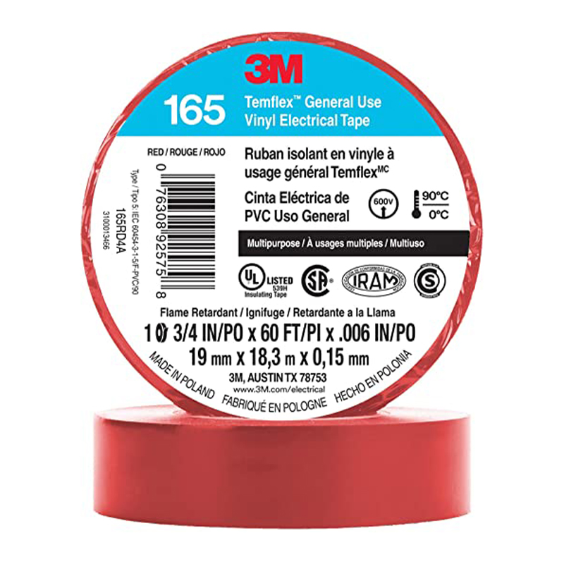 La Cinta Eléctrica de PVC 3M? Temflex? 165 de 0.152 mm (6 mils) de grosor es una cinta aislante de vinilo multipropósito y retardante a la llama. Está diseñada para funcionar a temperaturas ambiente de hasta 194 °F (90 °C). La cinta se adapta para aplicaciones en climas fríos hasta 32 °F (0 °C).