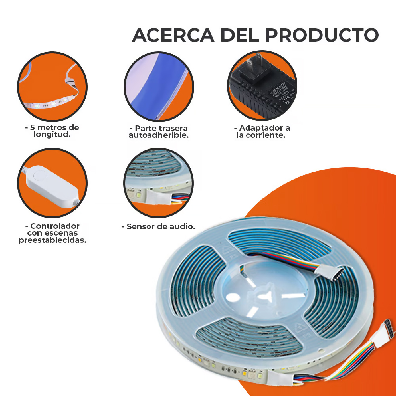 - Sensor de audio integrado: detecta el sonido ambiental con tu móvil, lo que hará encender y dar secuencia a los LEDs.