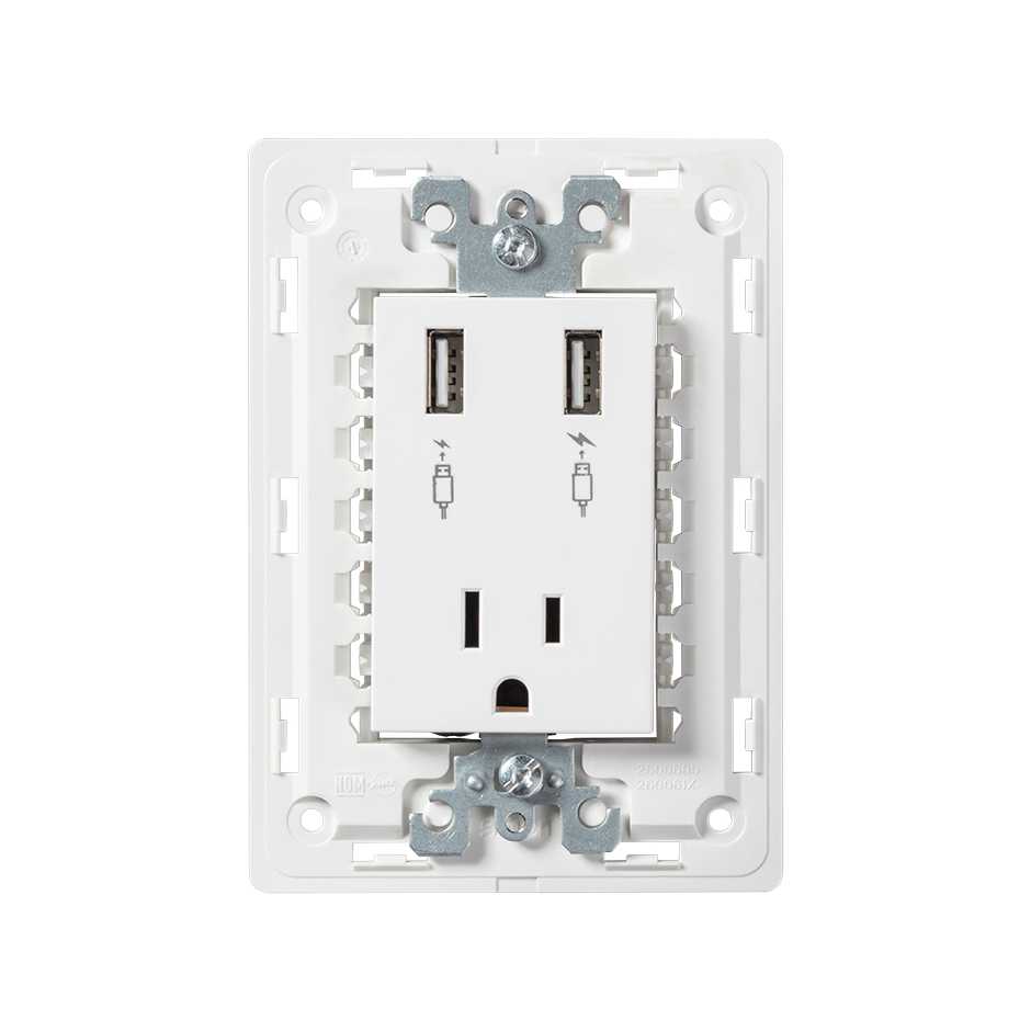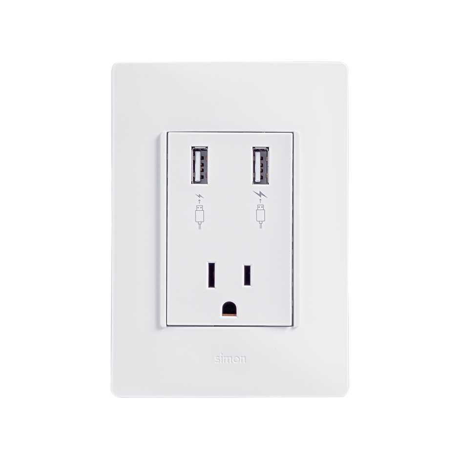 TOMA CORRIENTE 2P+T CON 2 CARGADORES USB [1.0A (IZQ) 2.1A (DER)] Y CHASIS BLANCO SIMON 26